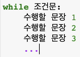 - while문: 반복 실행 횟수를 명확하게 알고 있지 않은 경우 사용