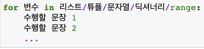 - for문: 반복 실행 횟수를 명확하게 알고 있는 경우 사용
