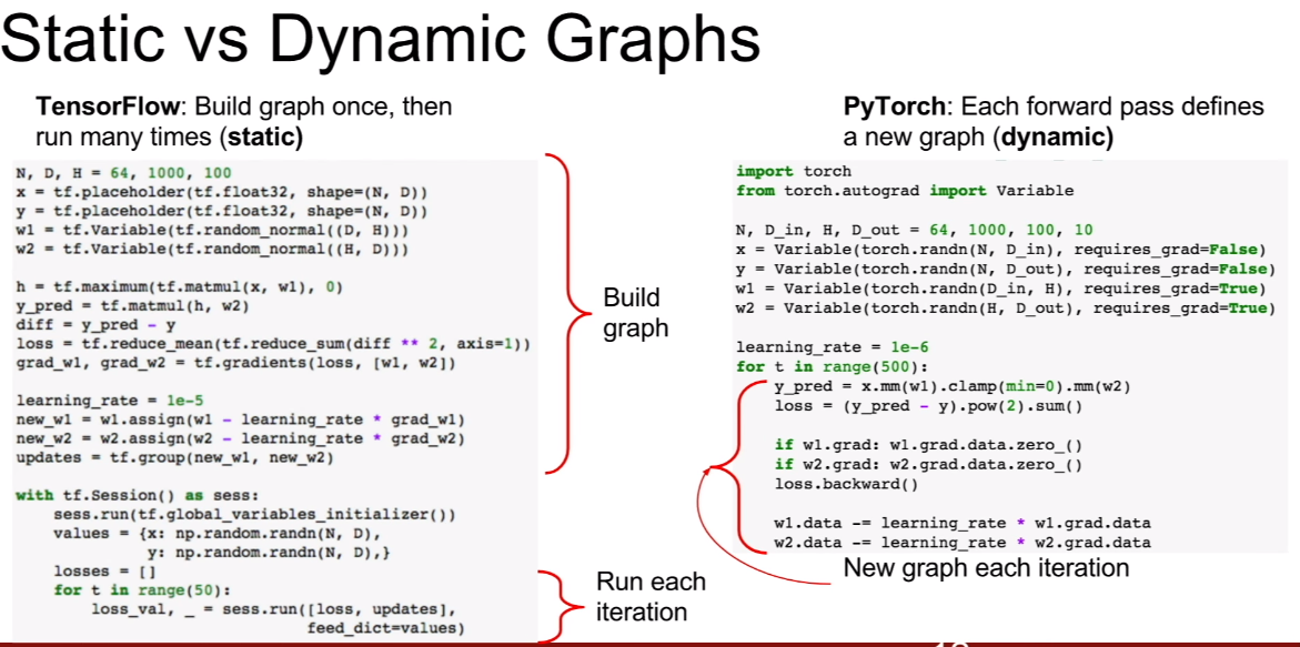 - Keras, TensorFlow는 static graphs를 사용하는 반면, PyTorch는 dynamic computational graph를 사용