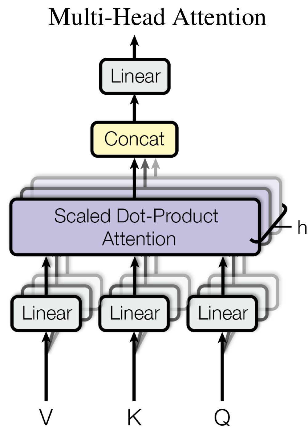 - \(\begin{aligned}\operatorname{MultiHead}(Q, K, V) & =\operatorname{Concat}\left(\operatorname{head}1, \ldots, \text { head }{\mathrm{h}}\right) W^O \\\text { where } \operatorname{head}_{\mathrm{i}} & =\operatorname{Attention}\left(Q W_i^Q, K W_i^K, V W_i^V\right)\end{aligned}\)