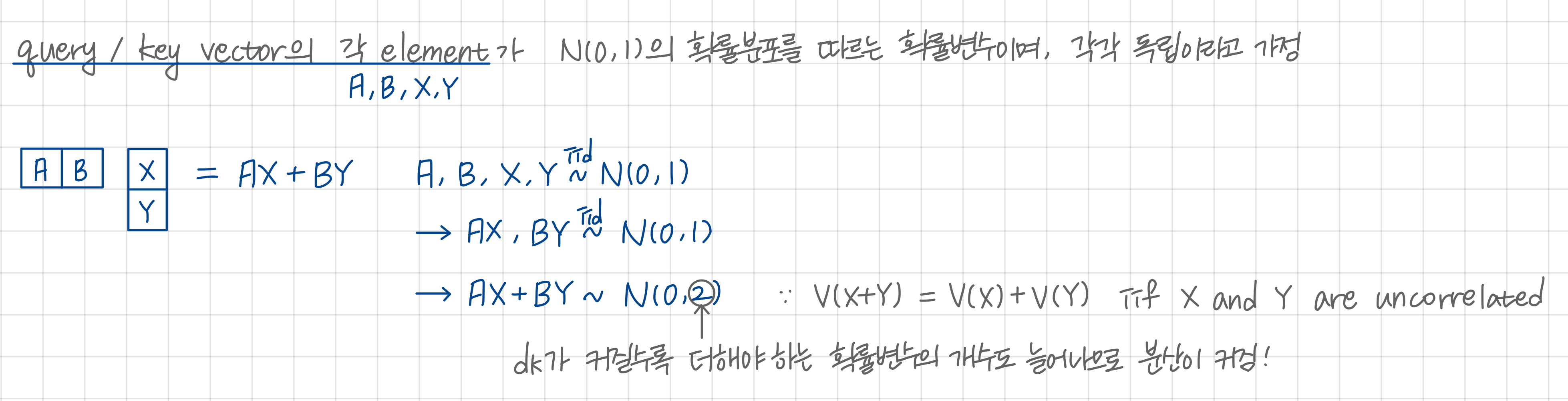 - \(d_k\)가 커지면 \(Q \cdot K^T\) matrix의 분산이 커짐