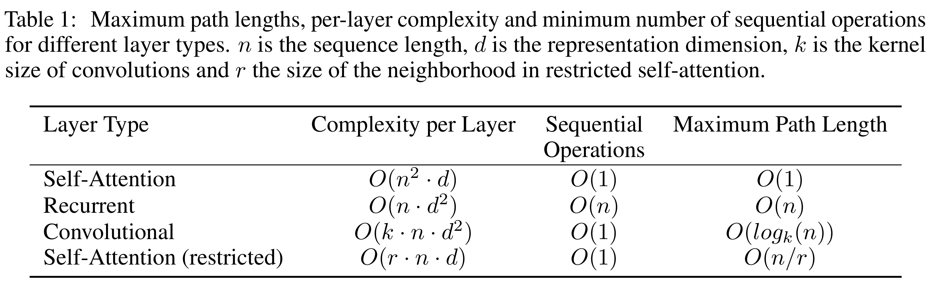 - sequence length n < representation dimensionality d 인 경우 self-attention이 recurrent보다 빠름