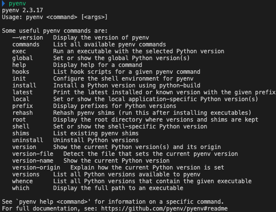 - 설치 후 터미널에서 pyenv를 실행했을 때 다음과 같이 출력되면 성공